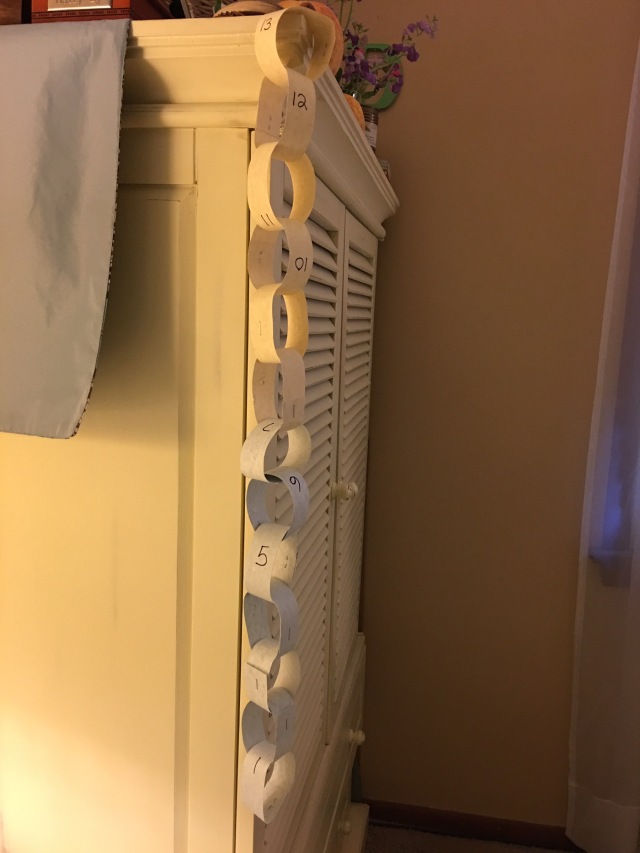 Every day after the anatomy scan, I rubbed my belly and felt for my son. I reported to Danith the number of times Kiri kicked and where he kicked. I reminded Kiri of the people who loved him and were waiting for his arrival. Every day I prayed for him. I thanked God for him, and I spoke to my biological mother about him, promising her that I would be a good mother. I perused the internet for baby items and considered the paint color for the nursery. I cut and stapled strips of paper to create a chain to count down the days and weeks to viability. Each day, I would tear off a link from the chain. I hung the chain from the corner of my armoire so that I could easily view it from my bed. Friends with whom I corresponded via only written words prayed and counted down the links with me. For the next few weeks, I remained on bedrest except for scheduled and emergency visits to the hospital. My body hung in a precarious position, but my hope for our son did not.
