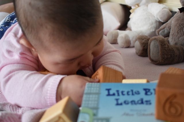 These days, Nora occupies me. She turns six months old today, and among her small group of friends, she weighs the most at 19 lbs and 8 oz. Anyone who takes notice of her remarks first on her chubby cheeks and second on her warm dark eyes. Almost like what our dog Pluto used to do, she greets me in the morning with a genuine “glad to see you” smile. She is able to sit unassisted for several seconds. She chews on books that I try to read to her, and she jumps up and down when I hold her up. She practices her vocal cord by babbling, and screeching like a pterosaur. She chuckles when I screech back. She enjoys the outdoors and being partly submerged in water. She started eating rice porridge almost two months ago, and because I want to make solids fun for her, I feed the porridge to her while she stands in her play station. After she bites on the white purée she would excitedly stomp her feet, roll her head, and bang on the toys around her. It awes me that my simple act of feeding her could give her that much pleasure.